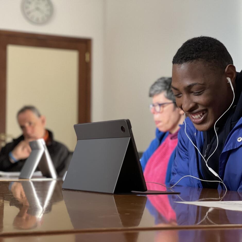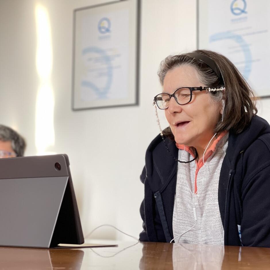 Numa videochamada com os alunos, os utentes estiveram a conversar e aprender com os estudantes, de forma a conhecê-los melhor e obter conhecimentos básicos de informática de forma a serem autónomos na utilização dos meios digitais.